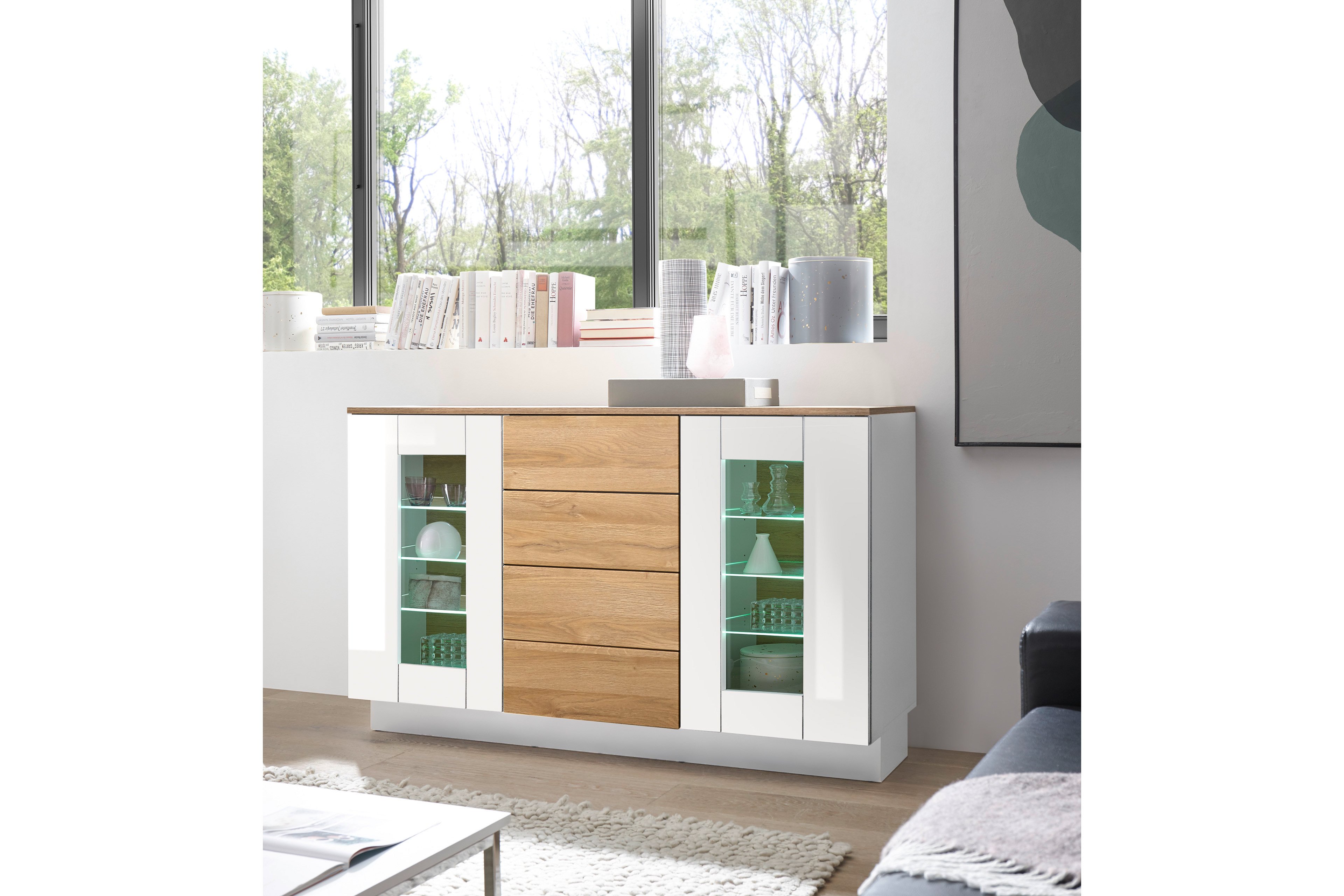 Das Kollektion Letz Sideboard Cayman-living ist nicht nur jung und attraktiv, sondern strahlt auch eine zeitlose Eleganz aus. Dies wird unter anderem durch die helle Grandson Oak Nachbildung bewirkt. Hinter den zwei Türen mit Glasausschnitt können Sie das gute Porzellan stilsicher präsentieren. Praktisch hierbei sind die ca. 6 mm dicken Glasböden. Auch die vier Schubkästen bieten ausreichend Stauraum für Besteck, Papiere oder Zeitschriften. Das edle Sideboard fügt sich nicht nur stilsicher in Ihr Esszimmer ein, sondern findet auch seinen Platz in Ihrem Wohnzimmer. Passend zur Wohnwand können Sie diese Kommode optimal als Ergänzung in Ihrem persönlichen Wohlfühlbereich einsetzen. Drapieren Sie doch einfach Ihre Lieblingspflanze auf dem Sideboard oder Ihre Bilder der Familie. Gestalten Sie Ihren schicken Hingucker, wie es Ihnen beliebt. Kollektion Letz Sideboard Cayman-living - Stilsicher, modern und attraktiv.