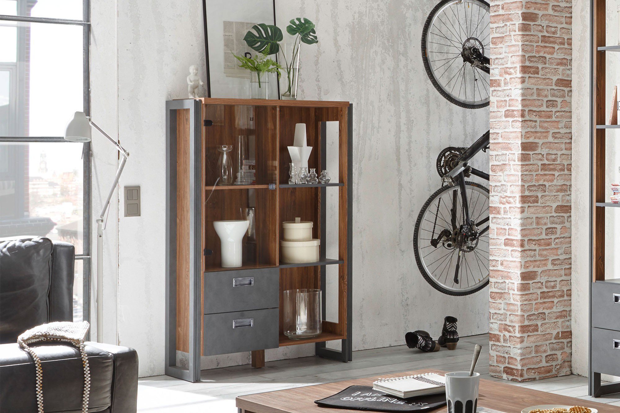 Sie suchen eine Kommode, welche sich mit ihrem Industrial Style perfekt in Ihre offene Wohnsituation eingliedert? Dann haben Sie mit dem Kollektion Letz Highboard der Serie Detroit Ihren passenden Partner gefunden. Durch die Kombination von der warmen Stirling Oak Nachbildung und der robusten Matera-Applikation wird der industrielle Schick unterstrichen und zusätzlich durch die zarte Glastür unterstützt. Abgerundet wird der edle Look durch die nobel wirkenden, in Altsilber gehaltenen Griffschlafen und Türgriffe aus robustem Kunststoff. Sie können Ihre Lieblingsstücke gekonnt im Vitrinenbereich in Szene setzen und daneben noch ein paar Bücher in den drei offenen Fächern platzieren. Wie Sie sehen, ist diese moderne Kommode in vielen Bereichen einsetzbar und fügt sich optimal in alle Wohnsituationen ein. Warum also noch lange zögern? Kollektion Letz - attraktives, junges Design für Ihr Heim.