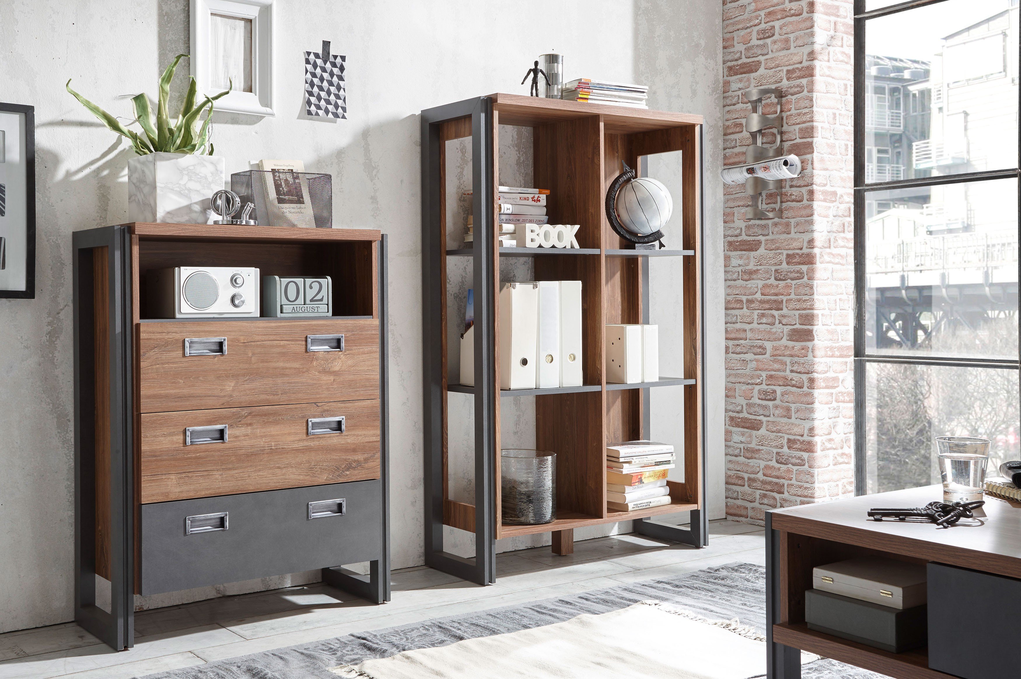 Sie suchen noch einen flexiblen Solisten für Ihren Wohn-, Ess- oder Schlafbereich? Dann können wir Ihnen die Kommode von Kollektion Letz wärmstens empfehlen. Gerade für Großraumwohnungen oder Lofts ist die Serie Detroit der perfekte Begleiter. Mit seinem Industrial Design, welches exzellent durch die edle Stirling Oak Nachbildung und die rustikale Matera-Applikation unterstrichen wird, ist die Kommode vielseitig einsetzbar. Auch die wirklichkeitsgetreuen Kunststoff-Griffschalen in Altsilber unterstützen den Look des industriellen Schicks vollends. Ausreichend Platz finden Sie in den drei geräumigen Schubkästen, welche sich sowohl als Sockenschublade als auch für Bastelutensilien nutzen lassen. Eine kleine Ablagefläche finden Sie in dem offenen Fach, in welchem Sie idealerweise ein Radio oder eine Uhr platzieren können. Holen Sie sich noch heute diesen wunderschönen Solisten zu sich nach Hause und ergänzen Sie Ihr offenes Wohnkonzept um ein weiteres Schmuckstück mit der Serie Detroit. Kollektion Letz - attraktives, junges Design für Ihr Heim.