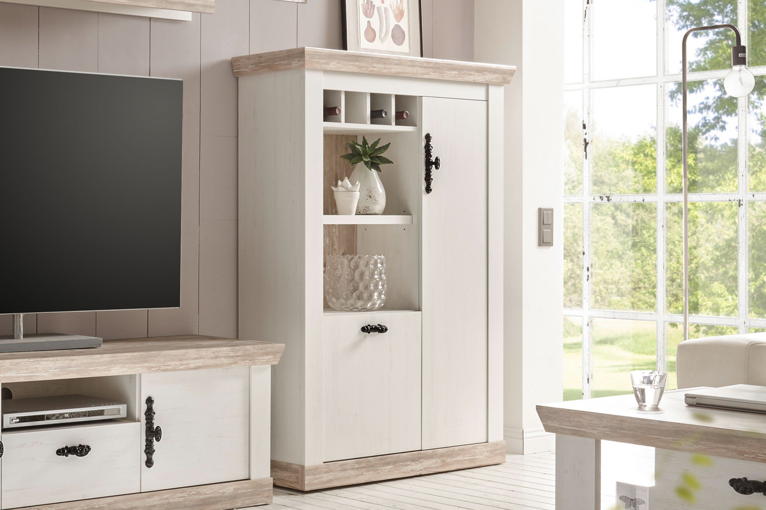 Stauraum gepaart mit dekorativen Elementen finden Sie in der Kollektion Letz Kommode 9P PL FZ 46, welche vor allem durch die edle weiße Pinie in der Front sowie dem Korpus besticht. Durch die Verwendung von Oslo Pinie als Absetzung wird dieser Kommode im klassischen Landhausstil zusätzlich ein maritimer Look verliehen, der durch die verspielten Metallgriffe elegant untermalt wird. Natürlich ist dieses Schmuckstück nicht nur schön anzusehen, sondern auch funktional ein wahrer König. Vier geräumige Fächer, die sich hinter den zwei Holztüren befinden, bieten Ihnen ausreichend Stauraum zur Unterbringung des guten Porzellans, der Filmesammlung oder wichtiger Papiere. In den zwei offenen Fächern, welche Sie übrigens mit der unter den Zusatzoptionen befindlichen zubuchbaren Beleuchtung ideal in Szene setzen können, haben Sie die Möglichkeit besondere Liebhaberstücke wie das Oma´s Geschirr und Ihre Lieblingsfilme zu präsentieren. Ihr präferierter Wein kann griffbereit in der Flascheneinteilung verstaut werden. Haben wir Sie überzeugt? Dann holen Sie sich noch heute das attraktive, junge Design von Kollektion Letz Möbeln in Ihr Heim und erwerben Sie diese Kommode.