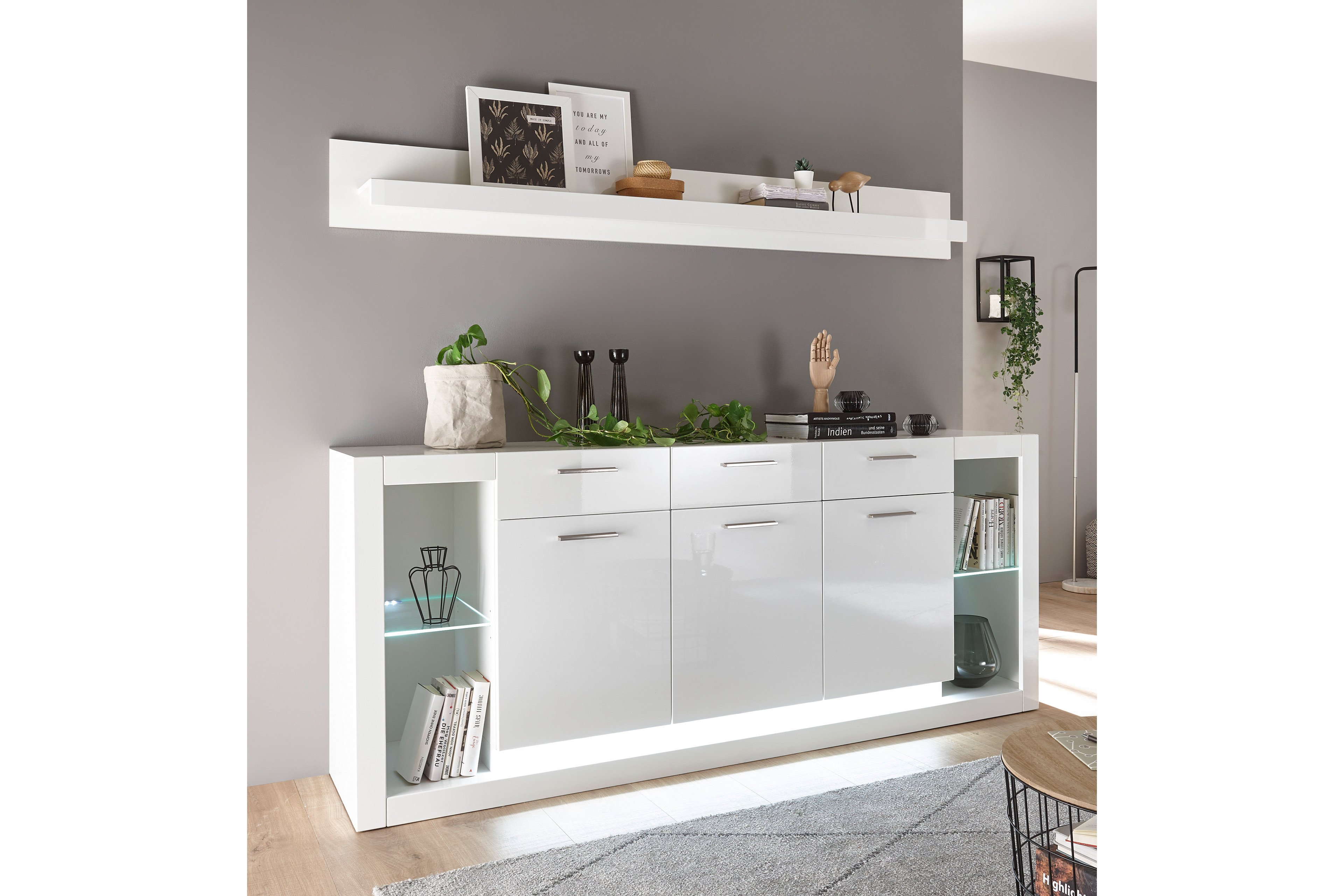Ein Sideboard, wie dieses aus der Modellreihe Meran von Kollektion Letz, darf in keinem Zuhause fehlen. Dieses Möbelstück wird Sie nicht nur mit einer atemberaubenden Ausführung in klassischem Weiß begeistern, sondern überzeugt Sie auch mit einer flexiblen Einsatzweise in all Ihren verschiedenen Wohnbereichen. So findet diese Kommode nicht nur in Ihrem Eingangsbereich, in Ihrem Wohnzimmer, in Ihrem Speisezimmer, sondern auch in Ihrem Schlafzimmer einen perfekten Stellplatz. Daher ist eine Unterbringung all Ihrer Habseligkeiten, wie von alltäglichen Utensilien, dekorativen Accessoires, kostbaren Vasen oder diversen Kleidungsstücken, jederzeit möglich. Ein weiteres Highlight dieses Möbelstücks sind die beiden LED-Beleuchtungen, welche Sie über unsere Zusatzoptionen optional erwerben können. Mit diesen tauchen Sie nicht nur Ihre Schmuckstücke in ein dezentes Licht, sondern bewirken in Ihrem Wohnbereich eine angenehme Atmosphäre. Lassen Sie sich von dem Mobiliar von Kollektion Letz aus der Modellreihe Meran inspirieren und kreieren Sie sich über unseren Möbelplaner Ihre perfekte Wunscheinrichtung.