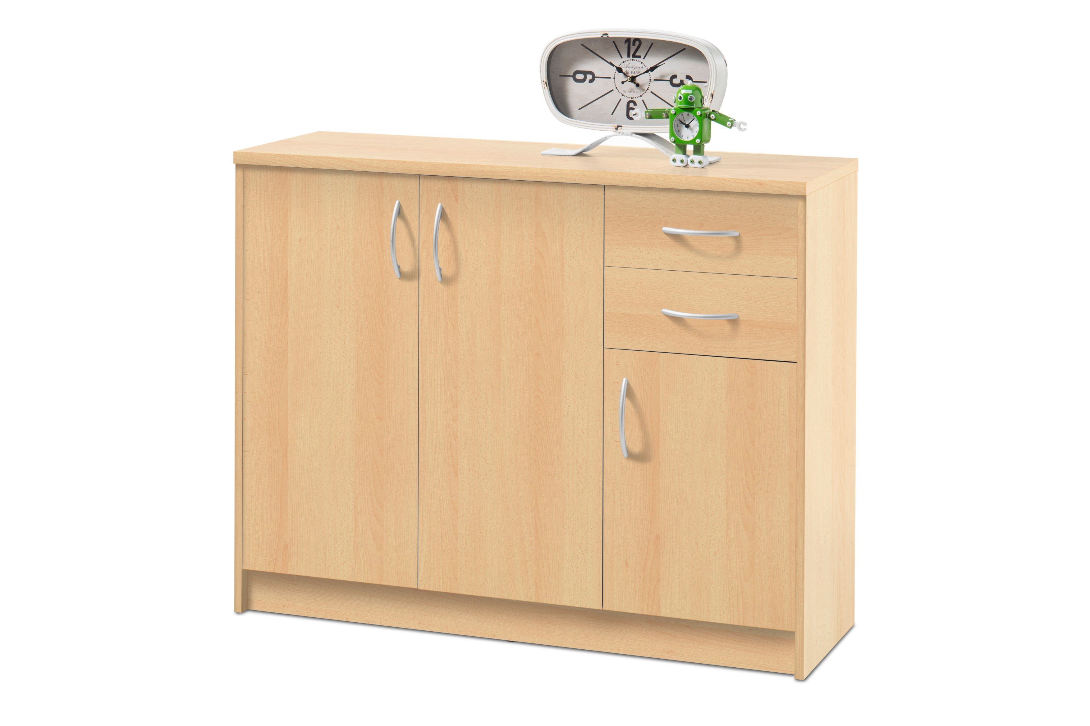 Ideal für kleine Räume präsentieren wir Ihnen eine platzsparende Kommode aus der Kollektion Letz. Dank der geringen Tiefe von circa 35 Zentimeter nimmt Sie wenig Platz in Anspruch und doch passt viel rein. Das Universaltalent aus der Kollektion Optimus zeigt sich in einer schicken und zeitlos modernen Buchen-Optik und ist besonders praktisch angeordnet. Hinter den beiden hohen Türen befinden sich zwei große Einlegeböden und hinter der kleineren rechten Tür befindet sich ein weiterer Einlegeboden. Auf den Einlegeböden können Sie Ihre größeren Gegenstände, wie Schuhe oder Geschirr, platzieren. Um kleinere Utensilien unterzubringen, kommen zwei Schubkästen infrage und die Ablagefläche eignet sich optimal, Ihre Dekoartikel zu präsentieren. Kollektion Letz - dynamisches Sortiment in aktuellen Farben und Optiken.