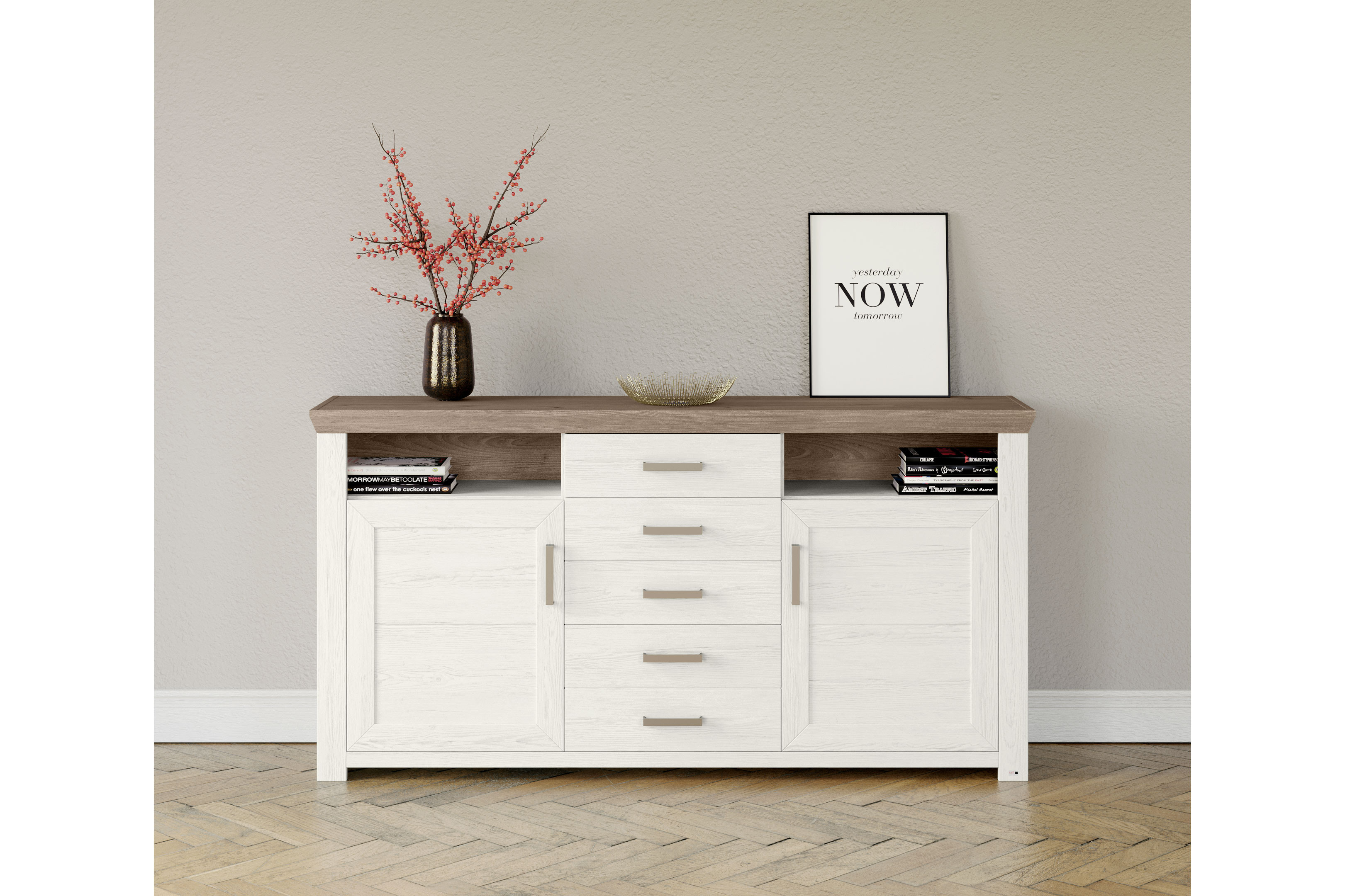 Mit einem Sideboard holt man sich praktischen Stauraum ins Haus, der auch noch richtig gut aussieht. Diese Kommode aus der Modellreihe York von set one by Musterring bezaubert mit der zeitlosen Ausführung in Pino Aurelio und Eiche Nelson, welche einen Hauch von Landhausstil in Ihre vier Wände bringen wird. Mit zwei Holztüren, jeweils einem dahinterliegenden Boden, fünf Schubkästen und zwei offene Fächer bietet das Möbel umfangreichen Stauraum sowie Ablagefläche und Präsentationsmöglichkeiten. Die eleganten Metallbügelgriffe setzen dem Design noch das i-Tüpfelchen auf. Entscheiden Sie sich für diese Ausführungsvariante oder eine der beiden anderen Optionen, um das Element ganz nach Ihrem Geschmack anzupassen. Die Schubkästen sind serienmäßig mit einer Unterflurführung sowie Softabstoppungen versehen. Für die Türen finden Sie diese Möglichkeit zur Auswahl in den Zusatzoptionen. Weitere passende Solisten sowie komplette Wohnwandvorschläge finden Sie im Typenplan und dem Möbelkonfigurator. Lassen Sie sich von set one by Musterring verzaubern.