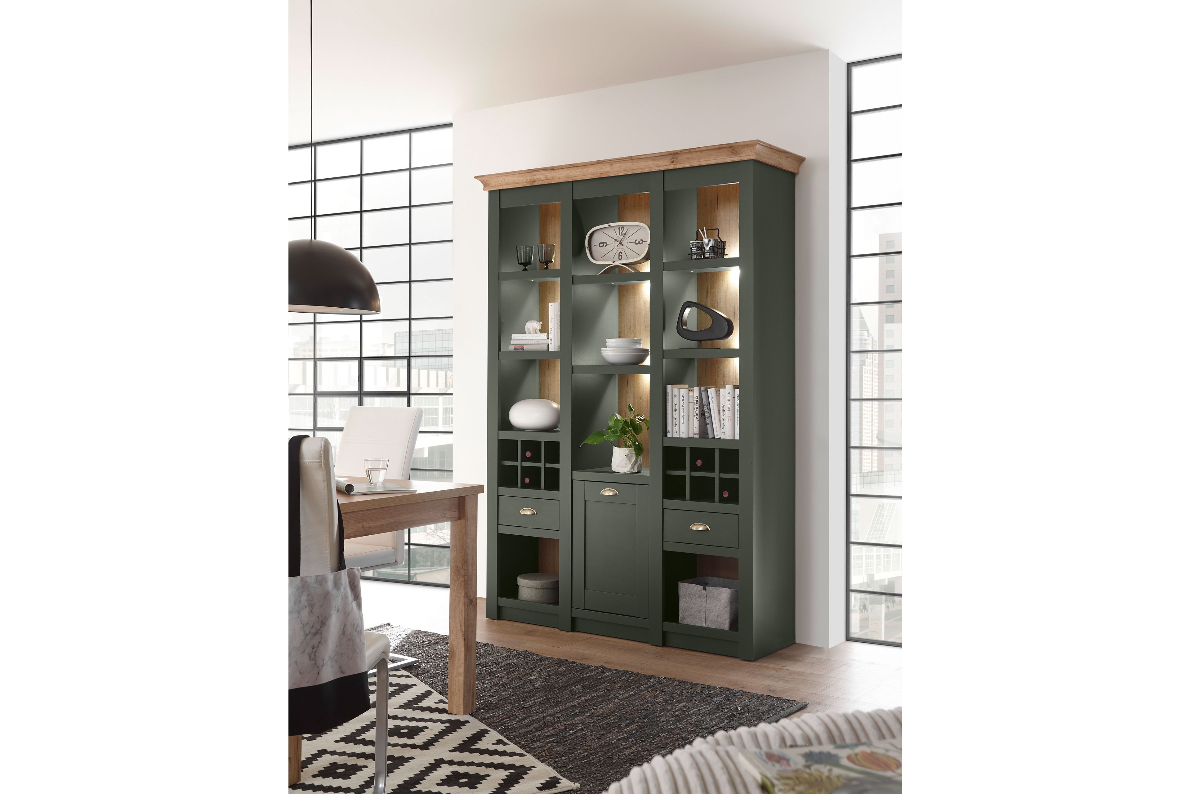 Die Möbelstücke aus der Modellreihe Cambridge von Kollektion Letz verleihen Ihrem Zuhause das gewisse Etwas. Eine Ausführung in Grün und Absetzungen in Wotan Eiche sorgen für ein außergewöhnliches und modernes Ambiente. Das Regal aus dieser Kollektion wird Sie und Ihre Liebsten besonders überraschen. Denn dieser Solist verfügt nicht nur über ausreichend Stauraum, um Ihre persönlichen Sachen, diverse Alltagsgegenstände oder wundervolle Dekorationsartikel in Griffnähe unterzubringen, sondern auch mittels der Flascheneinteilung Ihre kostbaren Weine ideal zu lagern. Eine LED-Beleuchtung in Warmweiß, welche Sie über unseren Zusatzoptionen erwerben können, sind das wahre i-Tüpfelchen, um Ihre Schätze in einem dezenten Licht auszuleuchten. Neben diesem Regal von Kollektion Letz erhalten Sie über unseren Möbelplaner die Möglichkeit, weiteres Mobiliar aus der Modellreihe Cambridge hinzuzuwählen. Stellen Sie sich Ihre persönliche Inneneinrichtung zusammen und lassen Sie sich von der Einzigartigkeit verzaubern.