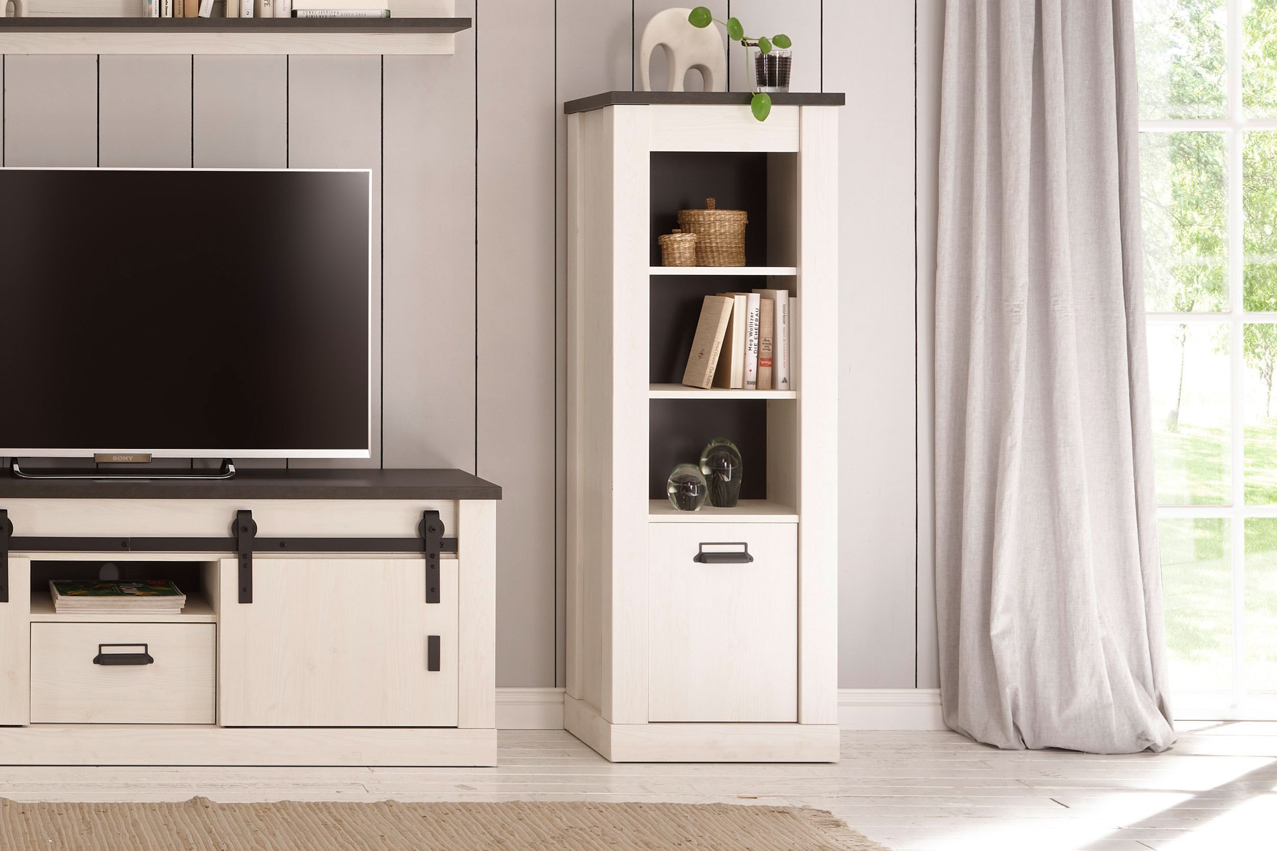 Möbel mit Pfiff finden Sie in der Möbelserie Sherwood aus dem Hause Kollektion Letz. Ein sehr wichtiges Möbelstück aus dieser Kollektion ist das abgebildete Regalelement. Mit diesem Allrounder bringen Sie frischen Wind in Ihre verschiedenen Wohnräume. Sowohl in Ihrem gemütlichen Wohn- und Essbereich als auch im Flur oder im Gästezimmer findet dieser Solist einen angemessenen Stellplatz. Ausgestattet mit einer Drehtür und drei offenen Fächern erhalten Sie Gelegenheit, nicht nur Ihre persönlichen und alltäglichen Utensilien außerhalb des Sichtbereichs zu verstauen, sondern auch die dekorativen Accessoires oder geliebten Familienbilder stilsicher zu präsentieren. Ein besonderer Clou dieses Möbels ist eine passende LED-Beleuchtung, welche nicht nur das Gesamtbild des Regals perfekt abrundet, sondern auch mit dem dezenten Licht für ein unvergessliches Ambiente in Ihrem Heim sorgt. Ebenfalls können Sie die Farbausführung nach Ihrem Geschmack anpassen. Nehmen Sie sich einen kurzen Moment, schauen Sie in die Zusatzoptionen und gestalten Sie Ihr sich neues Wunschmöbel.