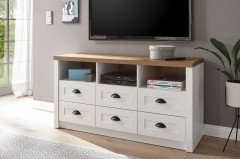Ein Lowboard, wie dieses aus der Modellreihe Provence des renommierten Herstellers Kollektion Letz lässt sich nicht nur wunderbar mit weiteren Einzelmöbeln oder aber auch mit kompletten Wohnkombinationen bestens verbinden, sondern wird auch als Solist zu einem wahren Hingucker. Die Ausführung aus hochwertiger Pinie in Weiß mit Absetzungen in heller Eiche sind die perfekte Mischung, um eine klassische und moderne Stilrichtung miteinander zu vereinen. So ist das Kollektion Letz Lowboard nicht nur für junge, sondern auch für junggebliebene. Mit einer Breite von ungefähr 130 cm können Sie Ihren neuesten Fernseher sowie weitere Mediengeräte gekonnt in Szene setzen. In den sechs Schubkästen werden Ihnen zudem ausreichend Möglichkeiten zur Unterbringung wichtiger Unterlagen oder anderer alltäglicher Utensilien gegeben, welche außer Sichtweite und dennoch griffbereit abgelegt werden sollen. Erschaffen Sie sich mit dem Mobiliar von Kollektion Letz aus der Modellreihe Provence Ihre gemütliche Wohnoase.