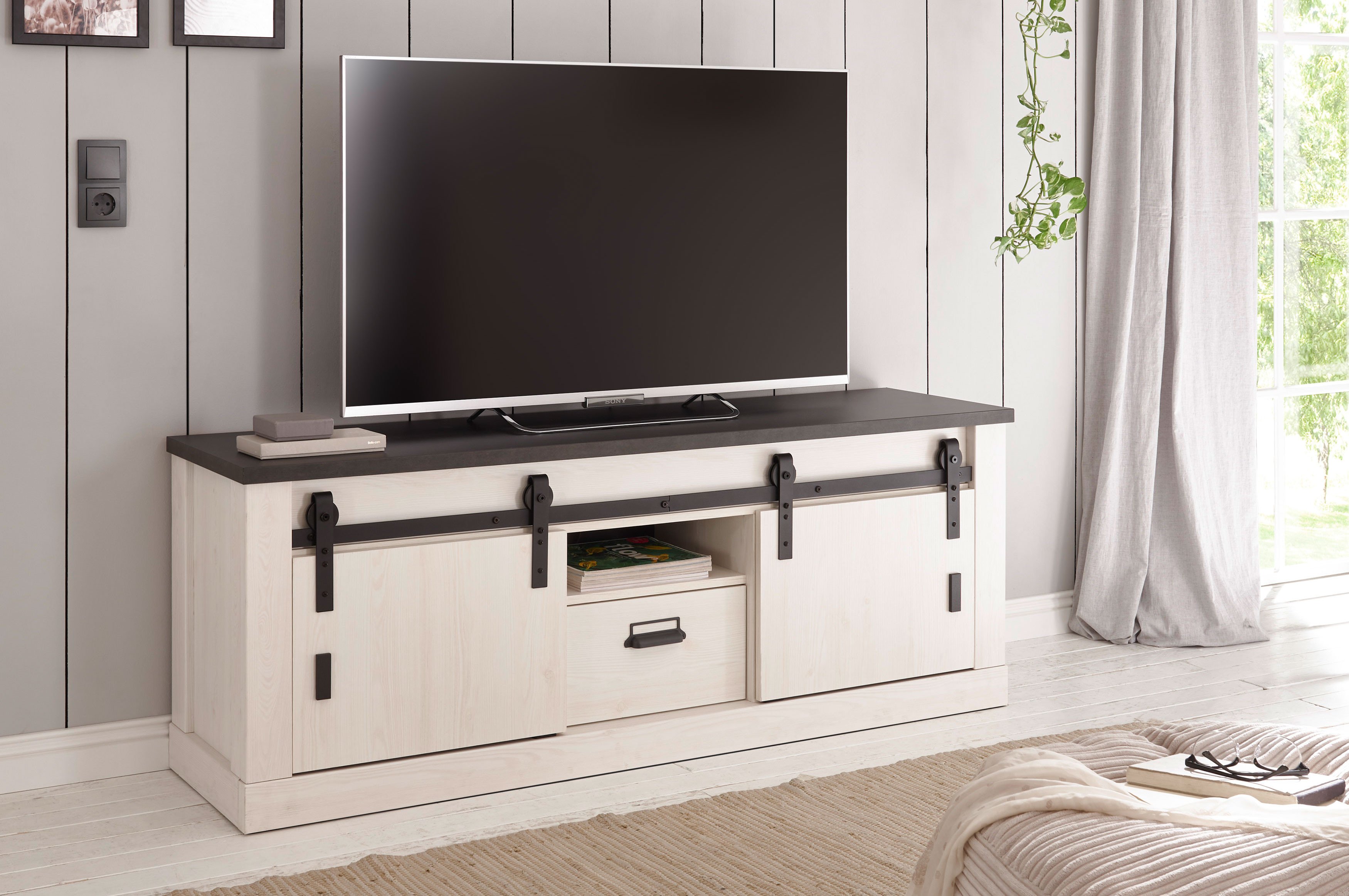 - Lowboard mit 2 Schiebetüren, 1 Schubkasten, 2 Böden und 1 offenen Fach