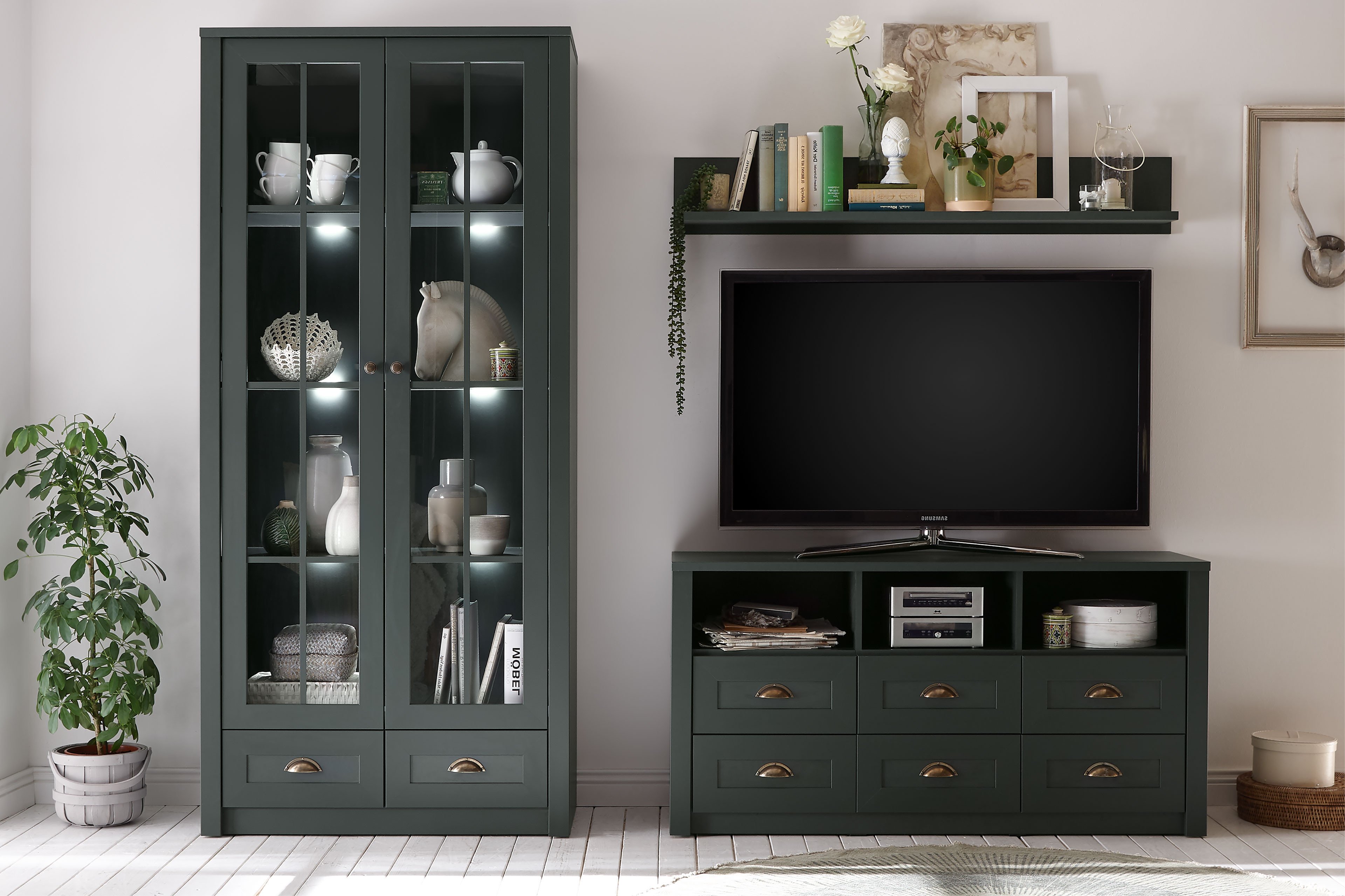 Eine Wohnwand, wie diese von Kollektion Letz aus der Modellreihe Ascot ist sowohl für große als auch kleine Wohnzimmer geeignet. Dieses Set besteht aus drei einzelnen Möbelelementen - einer Vitrine, einem Lowboard und einem Wandboard. Egal, ob Sie die Wohnwand vor einer Wand als zusammenhängende Kombination oder die Einzelmöbel flexibel in Ihrem Raum nutzen möchten - Sie können Ihren Wohlfühlraum jederzeit nach Ihren persönlichen Vorstellungen einrichten. Zudem verfügen die Solisten über beachtliche Unterbringungsmöglichkeiten für Ihre persönlichen und alltäglichen Utensilien. Eine LED-Beleuchtung für das Vitrinenelement setzt zudem Ihre unbezahlbaren Schätze besonders in Szene. Weitere Möbelstücke zum Verschönern Ihres geliebten Wohnbereiches finden Sie in unserem Möbelplaner. Erschaffen Sie sich mit dem Mobiliar von Kollektion Letz aus der Modellreihe Ascot Ihre persönliche Wohlfühloase und machen Sie es sich gemütlich.