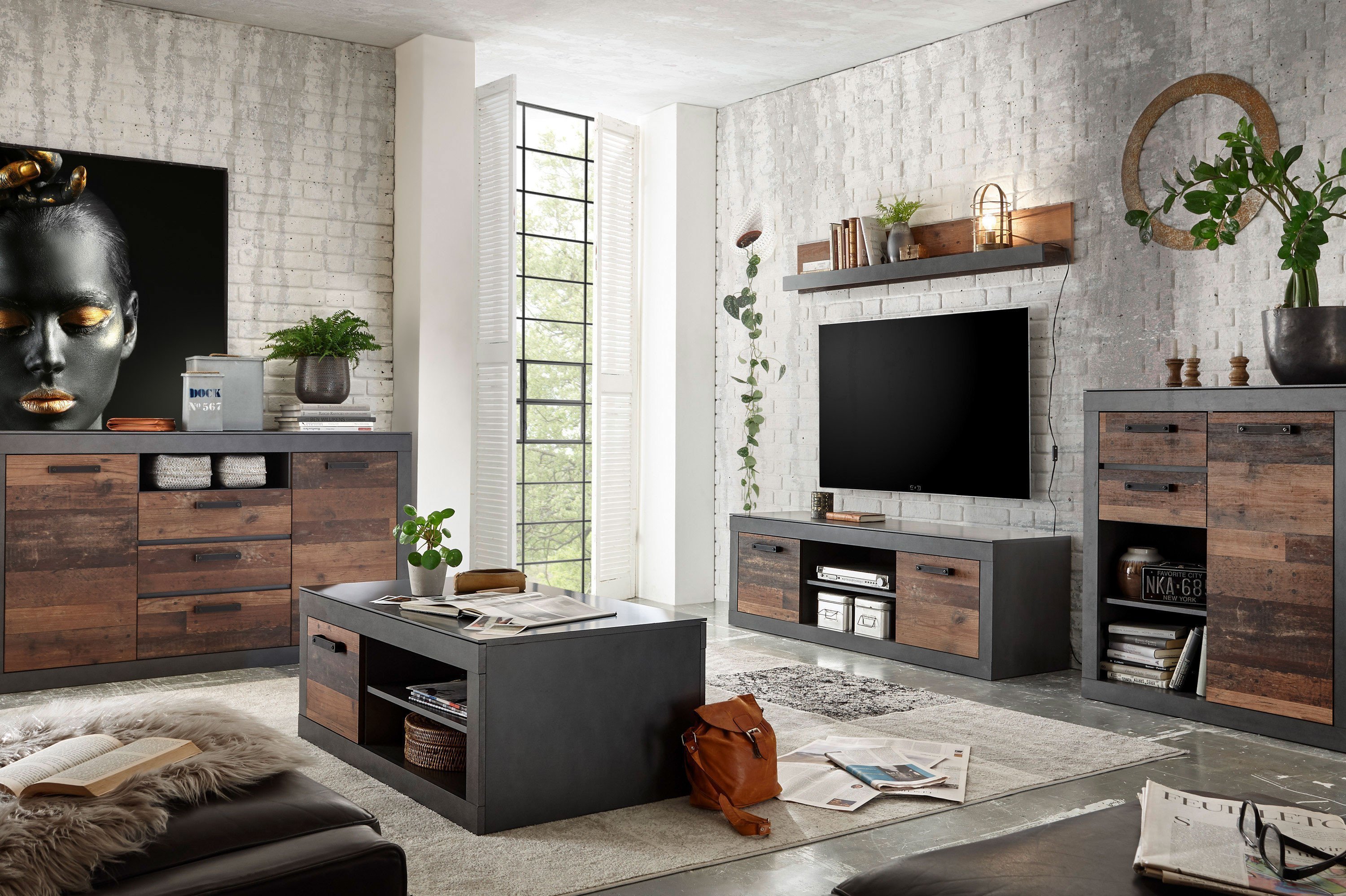 Wohnwand von Kollektion Letz - Modell Brooklyn 9MDMO2 in Old Mix Brooklyn - stilvoll im modernen Vintage-Look
