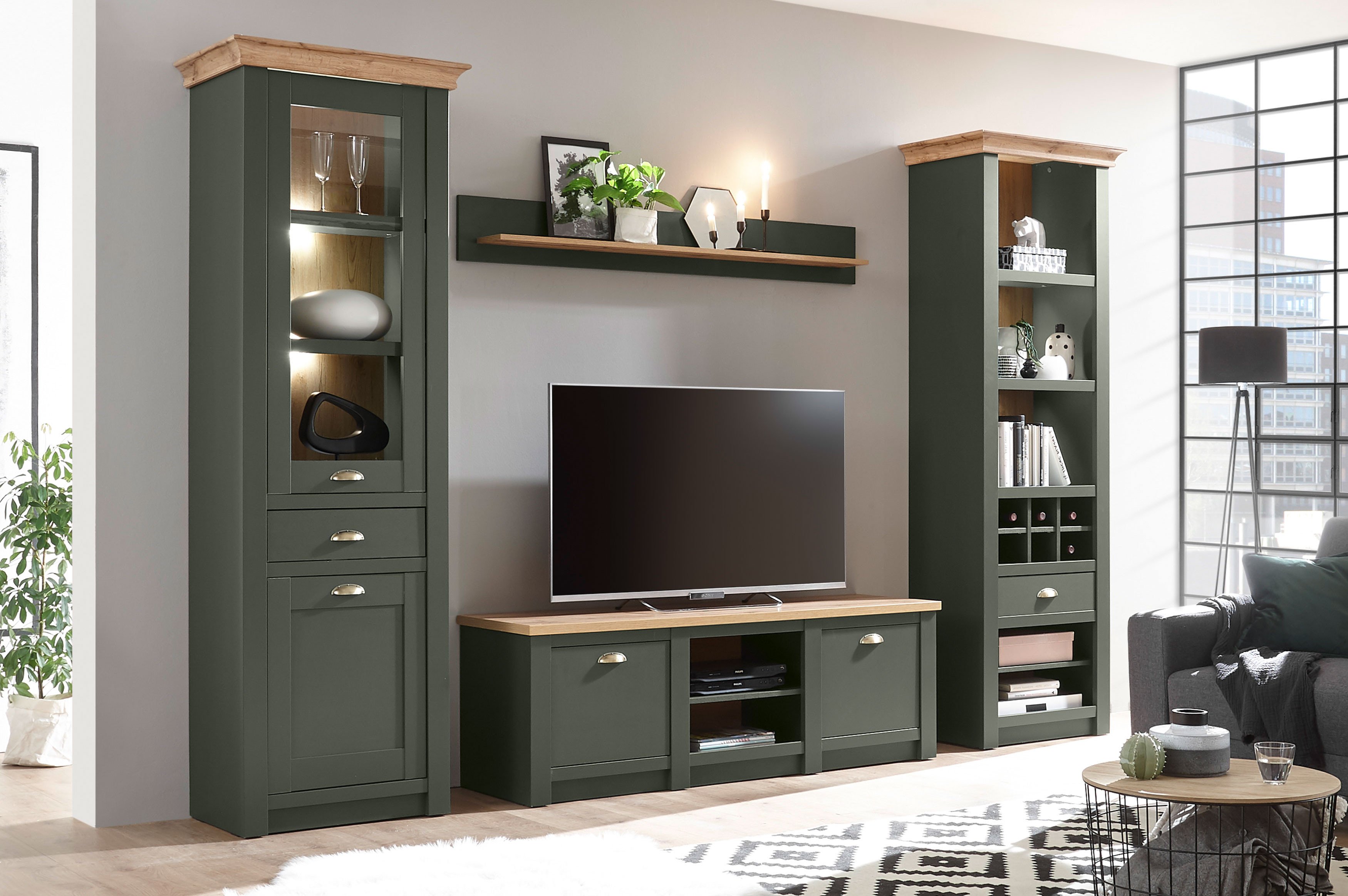 Eine Wohnwand, wie diese aus der Modellreihe Cambridge des renommierten Herstellers Kollektion Letz wird Ihren Ansprüchen in jeglicher Hinsicht gerecht. Dieses vierteilige Set, welches aus einer Vitrine, einem Lowboard, einem Wandboard und einem Regal besteht, wird Sie nicht nur mit einer modernen Ausführung in Grün mit Absetzungen in Wotan Eiche überzeugen, sondern auch mit beachtlichen Unterbringungsmöglichkeiten für all Ihre Habseligkeiten. So können Sie beispielsweise hinter den insgesamt drei Türen sowie in den zwei Schubkästen Ihre wichtigen Unterlagen oder alltägliche Utensilien außer Sichtweite und dennoch griffbereit verstauen. Ihren neuesten Fernseher, dekorative Accessoires oder Ihre geliebte Büchersammlung können Sie in den zahlreichen offenen Fächern sowie auf den Ablageflächen stilsicher präsentieren. Zudem ermöglicht Ihnen eine integrierte Flascheneinteilung Ihre kostbaren Weine ordnungsgemäß zu lagern. Buchen Sie über unseren Möbelplaner weiteres Mobiliar aus der Modellreihe Cambridge hinzu und erschaffen Sie sich so Ihre persönliche Wohlfühloase.