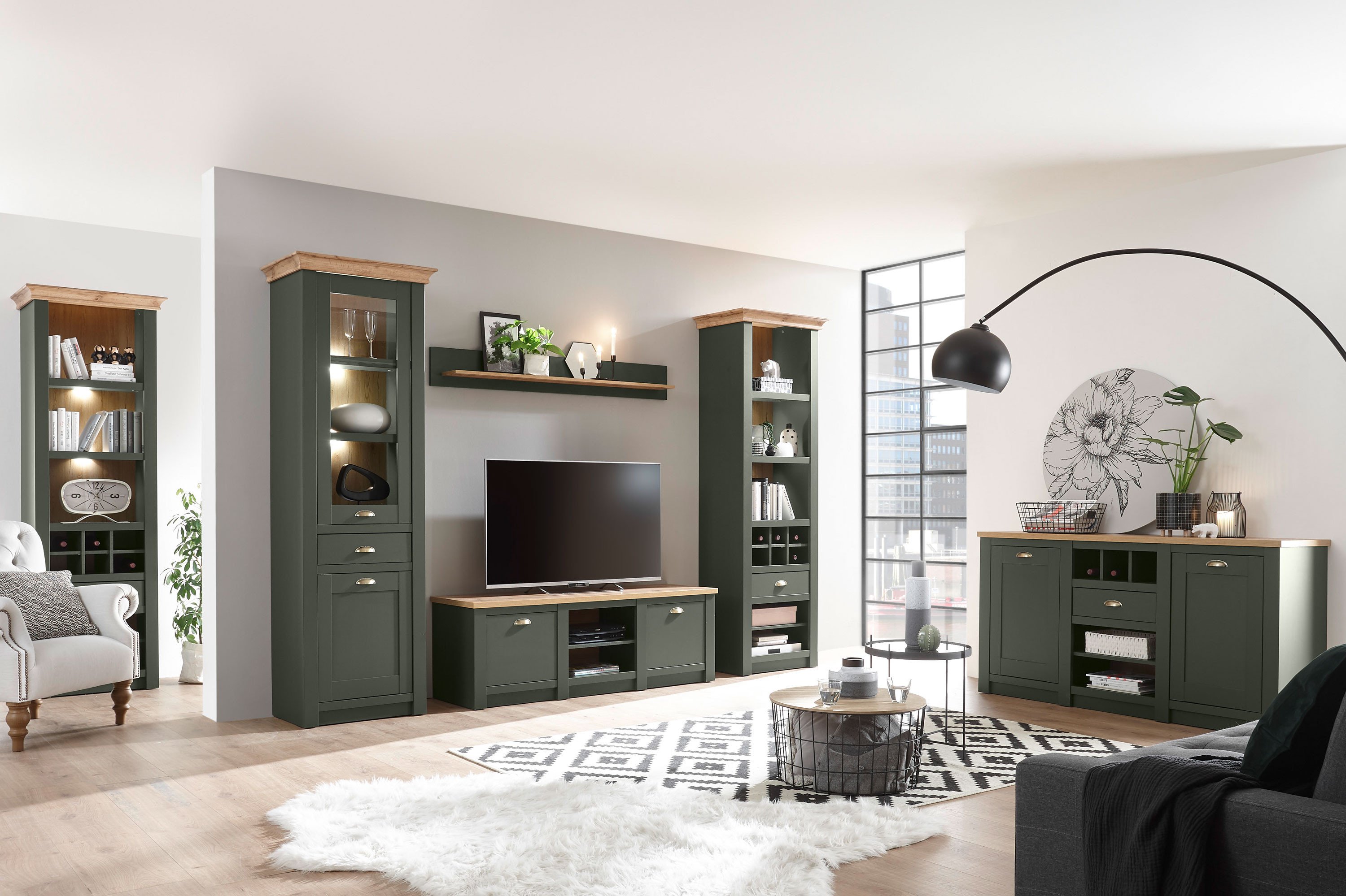 Eine Wohnwand, wie diese aus der Modellreihe Cambridge des renommierten Herstellers Kollektion Letz wird Ihren Ansprüchen in jeglicher Hinsicht gerecht. Dieses vierteilige Set, welches aus einer Vitrine, einem Lowboard, einem Wandboard und einem Regal besteht, wird Sie nicht nur mit einer modernen Ausführung in Grün mit Absetzungen in Wotan Eiche überzeugen, sondern auch mit beachtlichen Unterbringungsmöglichkeiten für all Ihre Habseligkeiten. So können Sie beispielsweise hinter den insgesamt drei Türen sowie in den zwei Schubkästen Ihre wichtigen Unterlagen oder alltägliche Utensilien außer Sichtweite und dennoch griffbereit verstauen. Ihren neuesten Fernseher, dekorative Accessoires oder Ihre geliebte Büchersammlung können Sie in den zahlreichen offenen Fächern sowie auf den Ablageflächen stilsicher präsentieren. Zudem ermöglicht Ihnen eine integrierte Flascheneinteilung Ihre kostbaren Weine ordnungsgemäß zu lagern. Buchen Sie über unseren Möbelplaner weiteres Mobiliar aus der Modellreihe Cambridge hinzu und erschaffen Sie sich so Ihre persönliche Wohlfühloase.