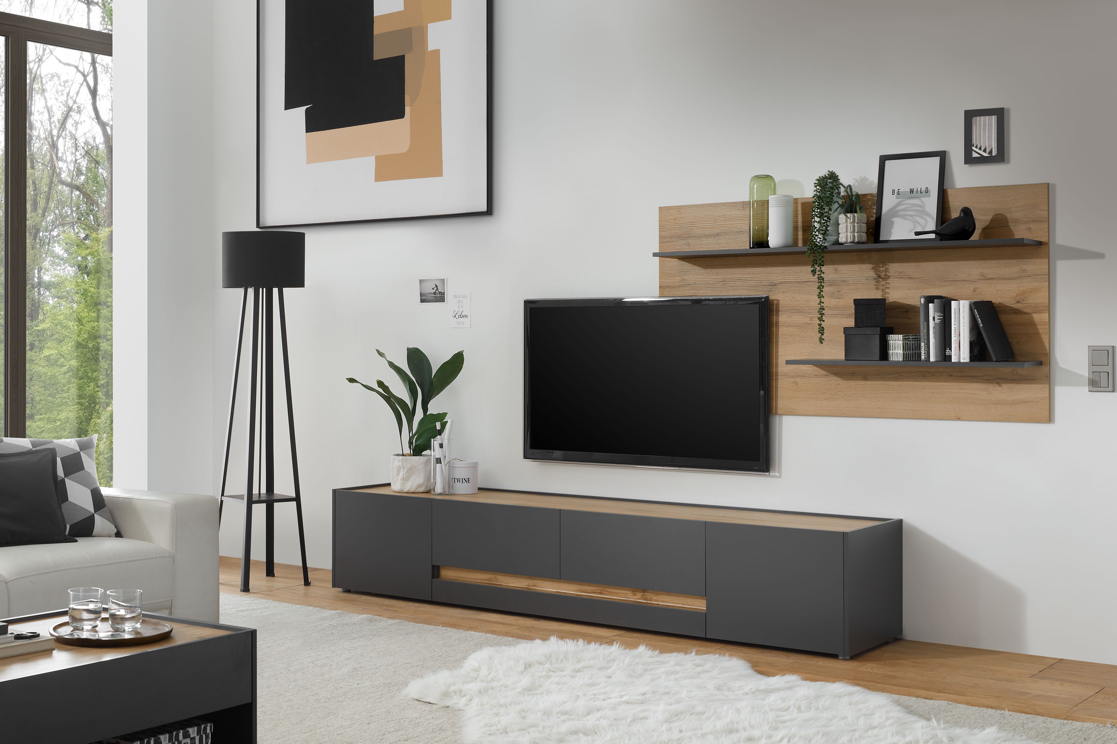 Eine klassische Farbausführung in Anthrazit mit edlen Absetzungen in Wotan Eiche macht diese Wohnwand aus dem Hause Kollektion Letz der Modellreihe City-living zu etwas ganz Besonderem. Das zweiteilige Set besteht aus einem TV-Unterteil mit zwei Türen und zwei Schubkästen sowie einem Wandpaneel mit zwei Ablageböden. So werden nicht nur alltägliche Utensilien oder verschiedenste Spielesammlungen geordnet untergebracht, sondern auch Ihre neueste Medientechnik wie beispielsweise der Fernseher oder die Spielekonsole gekonnt in Szene gesetzt. Obendrein bleibt auf der ca. 220 cm breiten Ablagefläche des Lowboards genügend Platz, um dekorative Accessoires oder geliebte Familienbilder stilsicher zur Schau zu stellen. Darüber hinaus können Sie mit der optional erhältlichen LED-Beleuchtung für das Wandpaneel stilvolle Akzente setzen. So werden zum einen Ihre geliebten Schätze in einem besonderen Licht erstrahlt und zum anderen erleben Sie ein einzigartiges Ambiente.