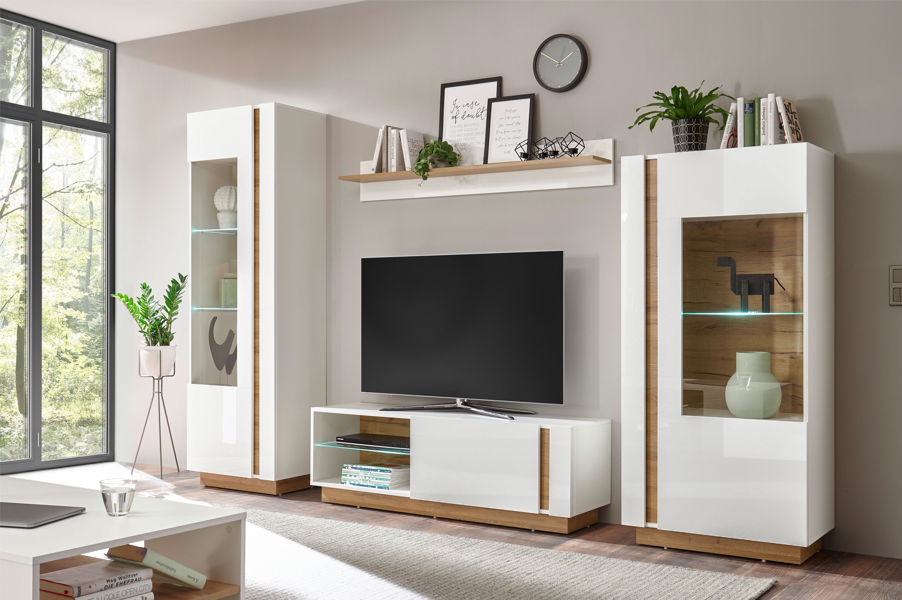 Elegant und modern präsentiert sich die Wohnwand von Kollektion Letz aus der Modellreihe Clair. Aufgrund der Ausführung in Weiß mit Applikationen in Grandson Oak wirkt diese Wohnkombination, sowohl zeitgemäß als auch klassisch. Das vierteilige Set besteht aus zwei Vitrinen, einem Lowboard und einem Wandboard. So haben Sie die Möglichkeit, nicht nur Ihre persönlichen Alltagsgegenstände oder Ihre wichtigen Unterlagen zu verstauen, sondern auch Ihre kostbaren Dekorationsartikel sowie Ihre neueste Medientechnik stilsicher zu präsentieren. Die LED-Beleuchtungen für die Glasböden versetzen zudem all Ihre Habseligkeiten in ein dezentes Licht und sorgen für ein angenehmes Ambiente. Gern können Sie den einen oder anderen Beisteller über unseren Möbelplaner hinzubuchen. So können Sie sich Ihre Wohnzimmereinrichtung ganz individuell und nach Ihren räumlichen Gegebenheiten zusammenstellen. Erschaffen Sie sich mit dem Mobiliar von Kollektion Letz aus der Modellreihe Clair Ihre Wohlfühloase.