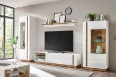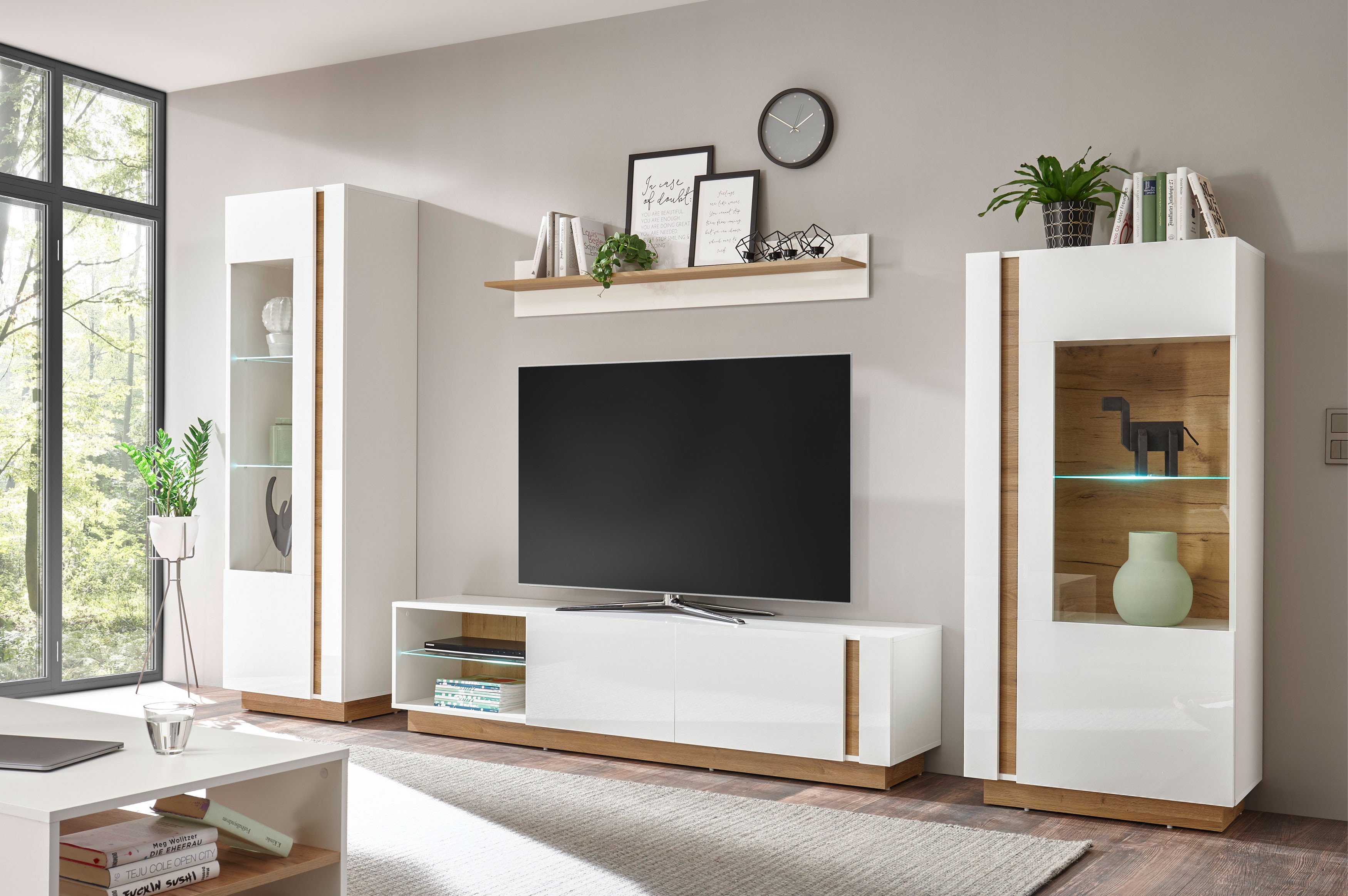 Elegant und modern präsentiert sich die Wohnwand von Kollektion Letz aus der Modellreihe Clair. Aufgrund der Ausführung in Weiß mit Applikationen in Grandson Oak wirkt diese Wohnkombination, sowohl zeitgemäß als auch klassisch. Das vierteilige Set besteht aus zwei Vitrinen, einem Lowboard und einem Wandboard. So haben Sie die Möglichkeit, nicht nur Ihre persönlichen Alltagsgegenstände oder Ihre wichtigen Unterlagen zu verstauen, sondern auch Ihre kostbaren Dekorationsartikel sowie Ihre neueste Medientechnik stilsicher zu präsentieren. Die LED-Beleuchtungen für die Glasböden versetzen zudem all Ihre Habseligkeiten in ein dezentes Licht und sorgen für ein angenehmes Ambiente. Gern können Sie den einen oder anderen Beisteller über unseren Möbelplaner hinzubuchen. So können Sie sich Ihre Wohnzimmereinrichtung ganz individuell und nach Ihren räumlichen Gegebenheiten zusammenstellen. Erschaffen Sie sich mit dem Mobiliar von Kollektion Letz aus der Modellreihe Clair Ihre Wohlfühloase.