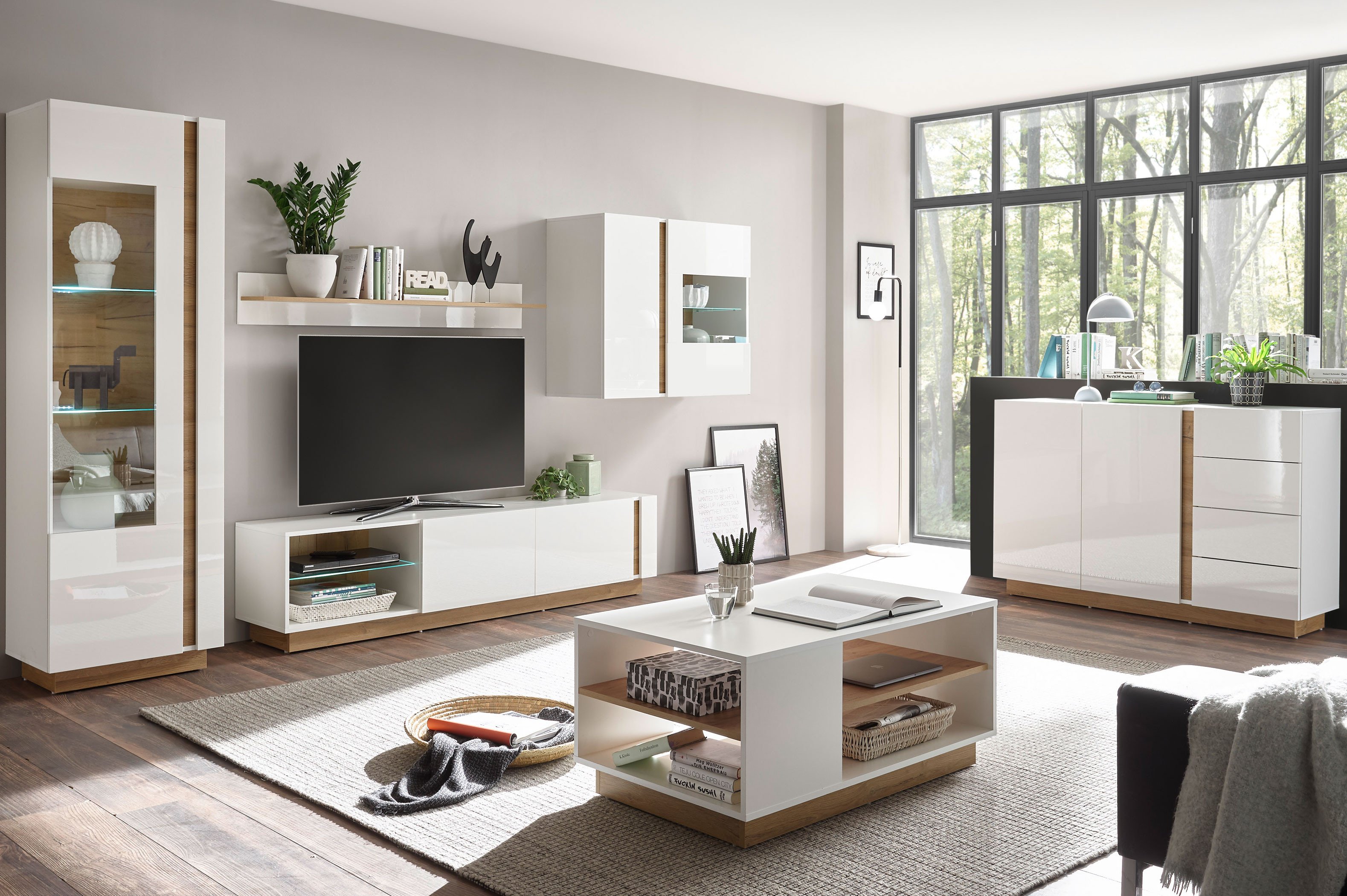 Erschaffen Sie sich einen Ort an dem Sie sich zu jeder Tageszeit zurückziehen und wohlfühlen können. Gerade deshalb sollte dieser Bereich auch mit einer ansprechenden Inneneinrichtung bestückt sein. Holen Sie sich die Wohnwand von Kollektion Letz aus der Modellreihe Clair in Ihr Zuhause und genießen Sie mit einer weißen Ausführung und den Absetzungen in Grandson Oak das angenehme Ambiente. Das vierteilige Set besteht aus einer Vitrine, einem Lowboard, einem Wandboard und einer Hängevitrine. In all den einzelnen Möbelstücken werden Ihnen ausreichend Unterbringungsmöglichkeiten für Ihre persönlichen Unterlagen und Ihre verschiedenen Alltagsgegenstände gegeben. Ihren neuesten Fernseher und Ihre dekorativen Accessoires können Sie dagegen auf den Ablageflächen sowie in den offenen Fächern stilvoll präsentieren. Die optional erhältlichen LED-Beleuchtungen für die Glasböden sind das i-Tüpfelchen dieser wundervollen Wohnwand. Genießen Sie die gemütliche Atmosphäre und fangen Sie an zu träumen.