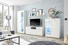 Sie wollen sich neu einrichten und Ihr Wohnzimmer in den Mittelpunkt rücken? Dann haben Sie mit der Wohnwand Enrique aus der Kollektion Letz genau das Richtige gefunden. Durch deren moderne Form und glänzenden Fronten erhellt diese jeden Raum. Mithilfe einer ausdrucksstarken Wandfarbe setzt man dieses Möbelstück grandios in Szene. Das einfach gehaltene Design in der Ausführung Hochglanz weiß passt sich jedem Zuhause an. Die Wohnkombination entzückt durch eine Vitrine mit zwei Türen und einem Glaselement, welche gleichzeitig Stauraum aber auch Ausstellungsfläche bietet, einen TV-Unterschrank, einem schicken Highboard inklusive einem Glaseinsatz sowie einem dekorativen Wandboard. Durch die integrierte LED-Beleuchtung werden Ihre anschaulichen Gegenstände zu einem wahren Glanzpunkt des Wohnzimmers. Mit dem TV-Unterschrank haben Sie einen perfekten Platz für Ihre Medienanlage gefunden. Auf dem Möbelstück kann Ihr Fernsehapparat gut platziert werden und in dem offengelegten Fach bietet sich Raum für Ihre digitalen Geräte, wie zum Beispiel den Receiver, aber auch den DVD-Player.