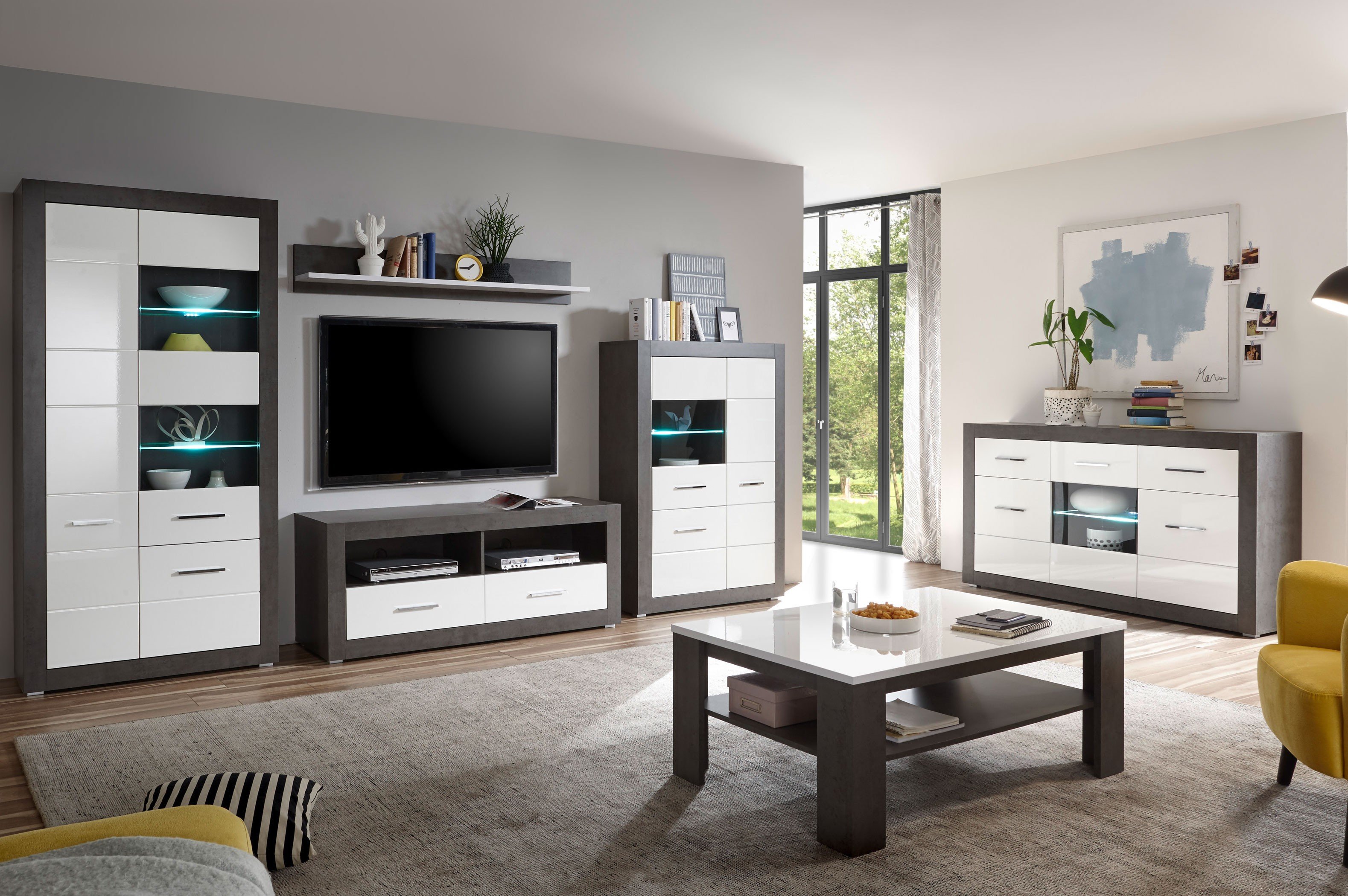 Moderner Stil trifft auf klare Formensprache - ein Slogan, welcher der Hersteller Kollektion Letz in der Modellreihe Etero bestens umgesetzt hat. Die Ausführung in einem hochglänzenden Weiß mit Applikationen in Dark Concret ist eine ideale Kombination, um eine geradlinige Stilrichtung mit modernen Akzenten zu verbinden. Die vierteilige Wohnwand besteht aus einem hohen Vitrinenelement, einem TV-Unterteil, einem Wandboard und einer kleinen Vitrine. Die Möbelstücke werden nicht nur als Set vor einer Wand mit einer Breite von mindestens 370 cm zu einem wahrlichen Blickfang in Ihrem Wohnzimmer, sondern glänzen auch hervorragend als Einzelelemente. Schließen Sie Ihre Augen, lassen Sie Ihren Gedanken freien Lauf und gestalten Sie sich Ihren Wohnbereich so wie Sie es möchten. Gern können Sie neben dieser Wohnwand von Kollektion Letz noch weitere Solisten über unseren Möbelplaner hinzubuchen. So haben Sie die Möglichkeit, sich ganz individuell einzurichten. Erleben Sie die Vielfalt mit dem Mobiliar von Kollektion Letz aus der Modellreihe Etero und kreieren Sie sich Ihren Lieblingsraum.