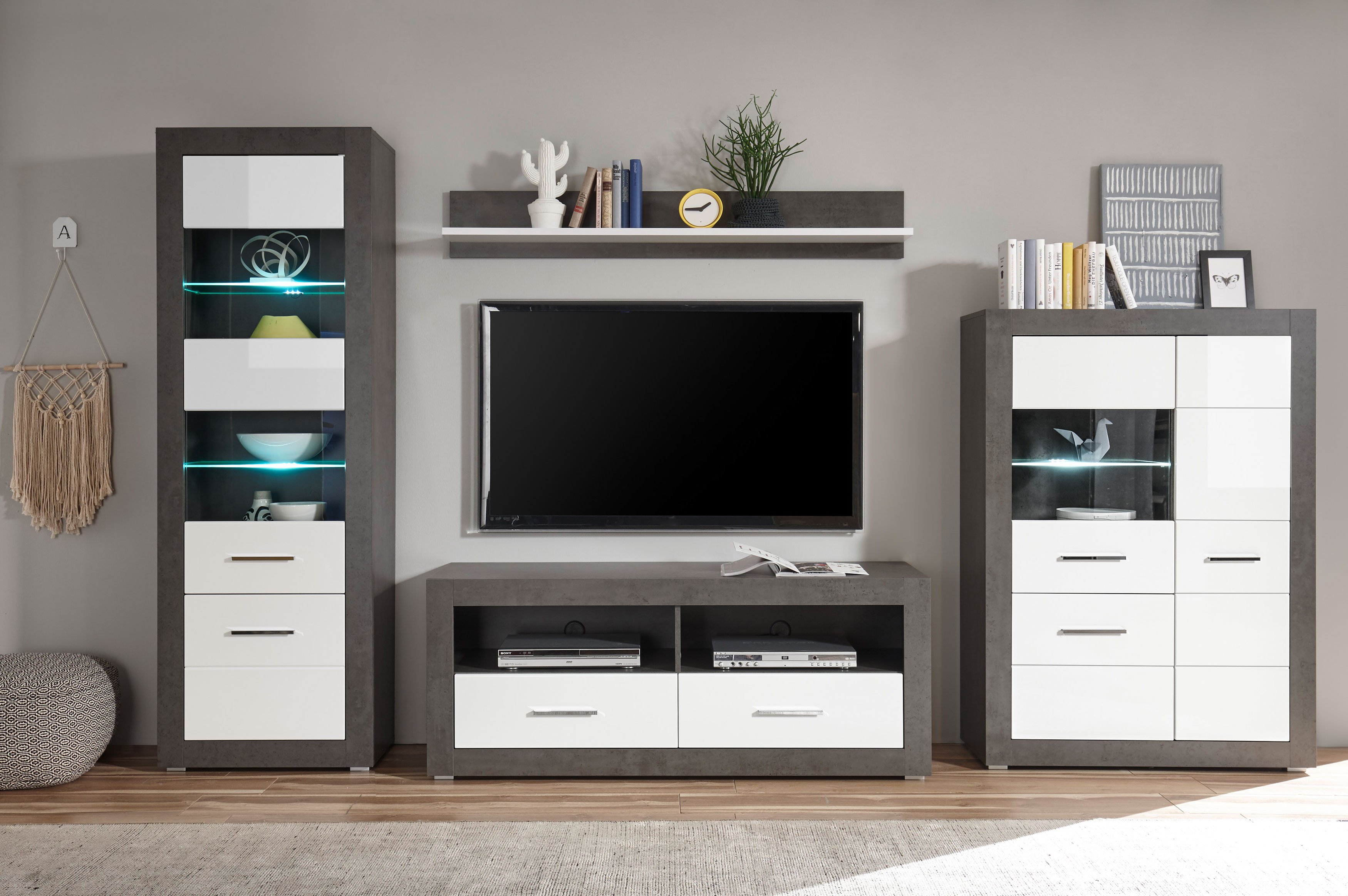 Sie sind auf der Suche nach Einrichtungsmöbeln in einer modernen Stilrichtung und einer klaren Formensprache? Dann ist die Wohnwand von Kollektion Letz aus der Modellreihe Etero genau das Richtige für Ihr gemütliches Wohnzimmer. Die Ausführung in weißem Hochglanz mit kontrastreichen Absetzungen in Dark Concret ist die ideale Kombination, um zeitgemäßes Design mit klarem Stil miteinander zu verbinden. Die vierteilige Wohnwand besteht aus einer hohen Vitrine, einem Lowboard, einem Wandboard und einem niedrigen Highboard. Diese Möbelstücke überzeugen aber nicht nur als Set, sondern werden auch als Solisten in Ihrem Wohnbereich zu einem wahren Augenschmaus. Egal, wie Sie sich einrichten - gestalten Sie sich Ihren Lieblingsraum ganz nach Ihren Vorstellungen und lassen Sie diesen Raum einzigartig erscheinen. Moderner Stil trifft auf klare Formensprache - das Mobiliar aus der Modellreihe Etero von Kollektion Letz.