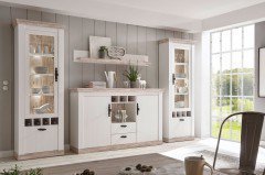 Mit der Kollektion Letz Wohnwand 9P PL F9 holen Sie sich eine atemberaubende Vielfältigkeit in Ihr Heim. Bestehend aus zwei Vitrinen mit je vier Fächern hinter einer Glasrahmentür, einem Sideboard mit vielen Unterbringungsmöglichkeiten und einem großflächigem Wandboard, findet die Zusammenstellung sowohl im Esszimmer, passend zu dem stilvoll gedeckten Esstisch, als auch im Wohnzimmer, als Ergänzung für die kuschelige Sofalandschaft, ihren Wirkungsbereich. Neben dem vielen Stauraum, welchen Sie durch die optional buchbare Beleuchtung noch aufwerten können, macht dieses Schmuckstück im klassischen Landhausstil auch optisch einiges her. Durch die elegante weiße Piniennachbildung in Front und Korpus und der markanten Oslo Pinie, welche ein maritimes Flair versprüht, als Absetzung, wird das Design versinnbildlicht und findet seine Untermalung in den wunderschönen, verspielten Metallgriffen. Zögern Sie also nicht länger und erwerben Sie noch heute dieses Prunkstück für Ihr geliebtes Heim. Kollektion Letz - junge, attraktive Möbel.