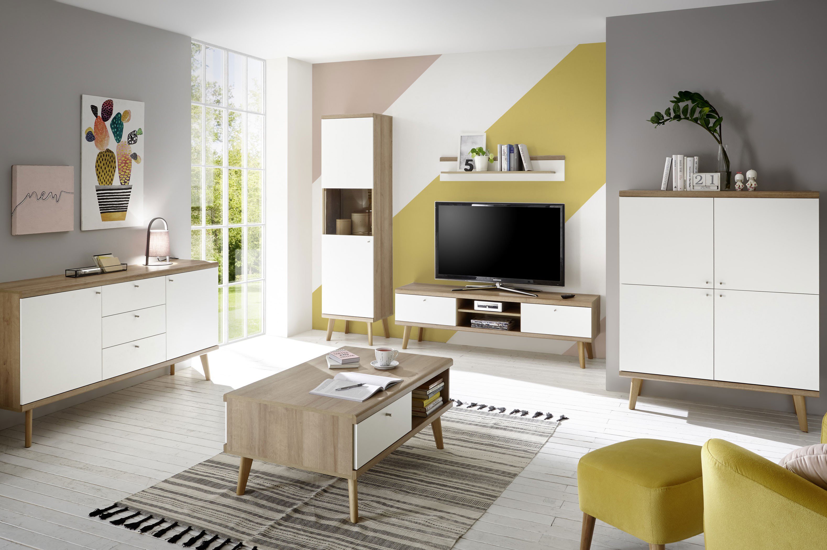 Der Hersteller Kollektion Letz hat sich bei der Modellreihe Lena den skandinavischen Stil zum Motto gesetzt. Die helle Farbgebung in einer Eiche Riviera Nachbildung mit einem weißen Akzent bringt Ihnen den Charme von Harmonie und Wohlbefinden in Ihr geliebtes Zuhause. Die Wohnwand von Kollektion Letz besteht aus einem Vitrinenelement, einem Lowboard, einem Wandboard und einem Highboard. Jedes Element ist unabhängig voneinander stellbar - so haben Sie die Möglichkeit, sich nicht nur in größeren Wohnbereichen, sondern auch in verwinkelten Räumen, stilvoll einzurichten. Zudem verfügen all diese wundervollen Möbelstücke über ausreichend Stauraum. So können Ihre persönlichen Unterlagen hinter den Türen sowie hinter den Klappen untergebracht werden. Diverse Dekorationsartikel und kostbare Medientechnik finden dagegen in den offenen Fächern sowie auf den Ablageflächen einen geeigneten Platz. Weitere Solisten können Sie in unserem Möbelplaner einsehen und jederzeit Ihrer neuen Wohnwand hinzufügen. Erleben Sie die Vielfalt im skandinavischen Stil - mit den Einrichtungsmöbeln von Kollektion Letz aus der Modellreihe Lena.