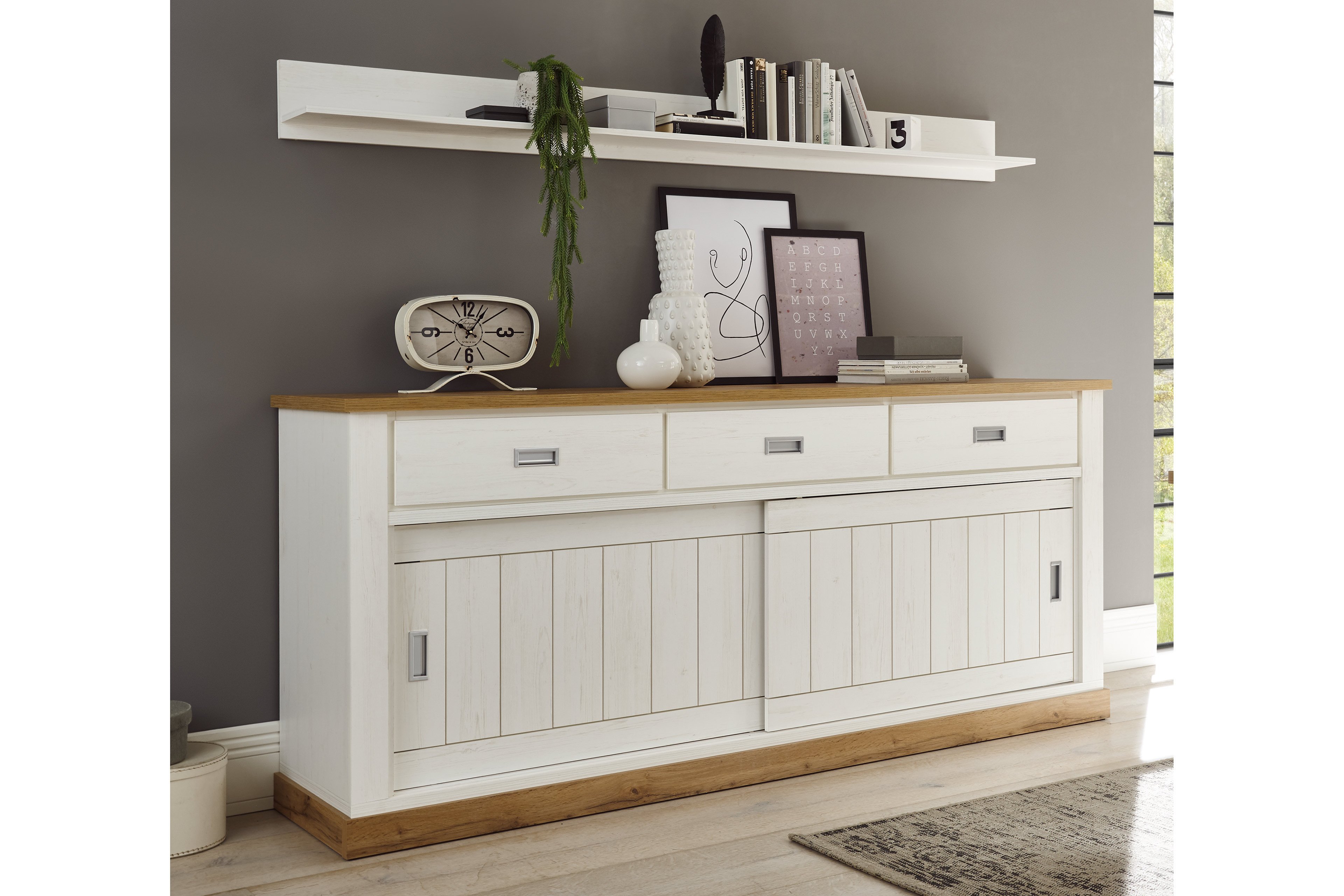 Eine wunderbare Ergänzung im schlichten und trotzdem modernen Design möchten wir Ihnen nun zeigen. Das Sideboard und das Wandboard der Serie Orlando aus dem Hause Kollektion Letz bestechen durch den zeitgemäßen Look, welcher seine Untermalung mit der matt weißen Pinien-Ausführung und den Absetzungen in Wotan Eiche erhält. Auch die silberfarbenen Kunststoffgriffe unterstützen das elegante Äußere. Darüber hinaus finden Sie ausreichend Stauraum hinter den beiden Schiebetüren, in den drei Schubkästen sowie auf der großzügigen Ablagefläche. All Ihre Habseligkeiten, wie persönliche Sachen, alltägliche Gegenstände, wunderschöne Dekoration oder aber auch diverse Kleidungsstücke, können so ordentlich und aufgeräumt untergebracht werden. Sichern Sie sich noch heute diese stylische zweiteilige Set von Kollektion Letz als Ergänzung für Ihr Wohnzimmer, für Ihren modernen Essbereich oder für Ihr gemütliches Schlafzimmer. Mit der Möbelserie Orlando von Kollektion Letz holen Sie sich zeitgemäßes Flair in Ihre vier Wände und schaffen sich eine wahre Wohlfühlatmosphäre.