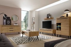 Ein Hauch des Nordens. Mit diesem Motto wurde die Modellreihe Torge aus dem Hause Kollektion Letz kreiert. Mit einer hochwertigen Eichen-Ausführung und mit schwarzen Absetzungen verfeinert, wirkt diese Wohnwand geradlinig und modern. Lassen Sie sich zudem von den beachtlichen Unterbringungsmöglichkeiten überzeugen. Denn das dreiteilige Set, welches aus einem Lowboard, einem Wandboard und einem Highboard besteht, verfügt nicht nur über Stauraum, um Ihre persönlichen Sachen oder Ihre alltäglichen Gegenstände außer Sichtweite zu verstauen, sondern auch über ausreichend Präsentationsfläche für Ihre neuesten Mediengeräte oder Ihre geliebten Familienbilder. Mit weiterem Mobiliar aus der Modellreihe Torge machen Sie Ihr Wohnzimmer komplett. Schauen Sie hierfür in unserem Möbelplaner und lassen Sie sich von der Auswahl inspirieren - Ihrer Kreativität sind keine Grenzen gesetzt. Gestalten Sie sich Ihre individuelle Zusammenstellung und erschaffen Sie sich Ihren Wohn(t)raum.